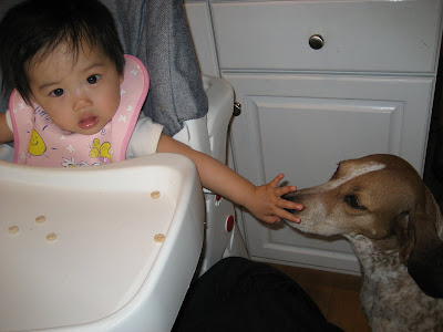 - She has caught on to the fact that if she drops something from her highchair, the dogs pick it up, so sometimes, just for fun she drops Cheerios for them - oh, and she sometimes lets them lick her hands...
